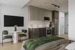 Les résidents bénéficient de nombreux espaces communs : cuisine et lounge partagés, gymnase entièrement équipé, salon de toilettage pour animaux et terrasse sur le toit, créant un véritable espace de vie pensé pour le confort et le bien-être.